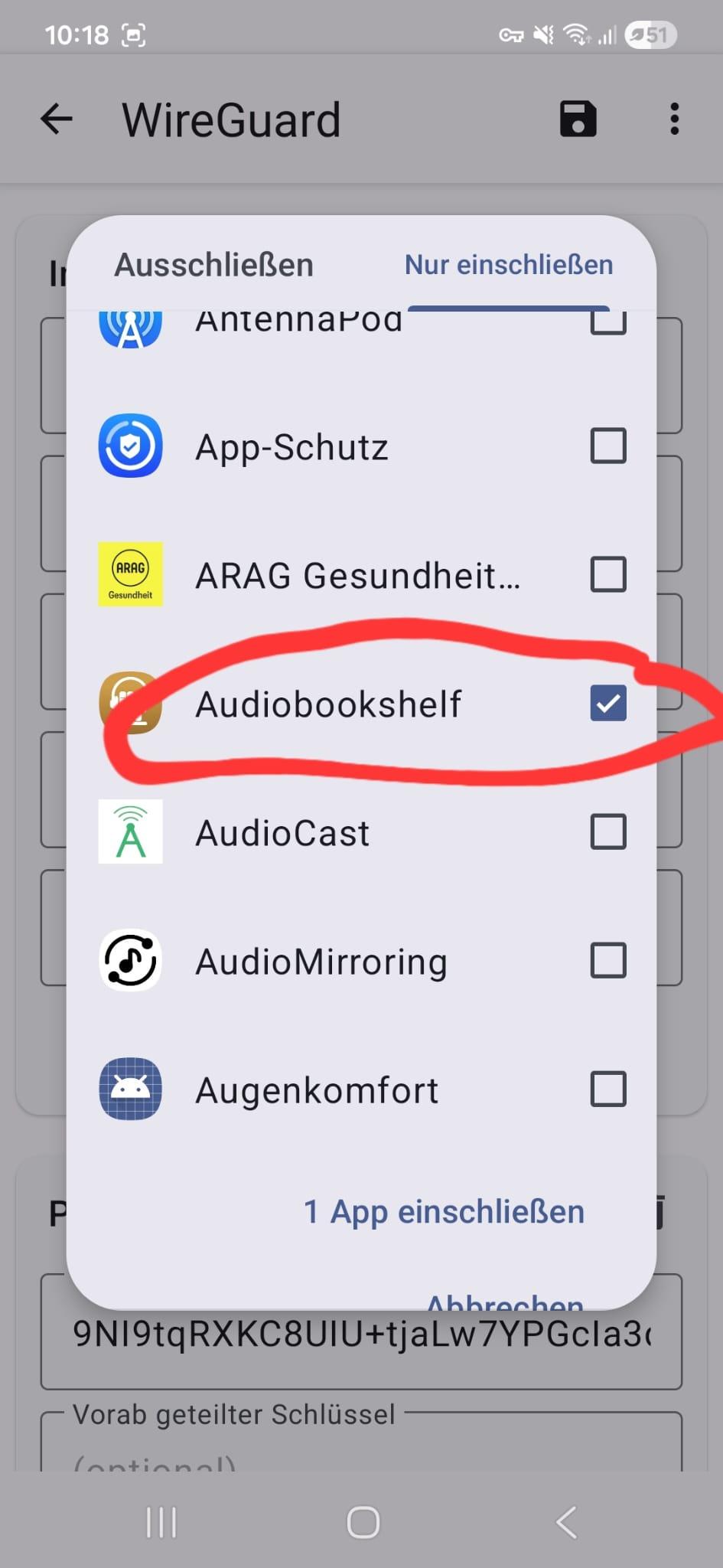Die Lösung dieses Problem ist allerdings einfach, man muss auf dem Handy in WireGuard einstellen, das er den Tunnel nur für Audobookshelf verwendet werden soll.